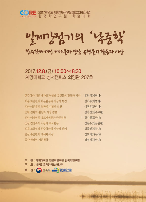 계명대학교 인문학연구단 한국학연구원은 “일제강점기의 ‘낙중학(洛中學)’, 한주학파 재전(再傳) 제자들과 영남 유현들의 활동과 사상”을 주제로 한 학술대회를 개최하고자 합니다. 이 학술대회는 계명대학교 인문역량강화(CORE)사업 중 하나로 마련되었습니다.