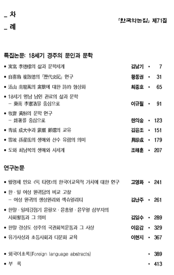 『한국학논집』71집이 2018년 6월 30일자로 발간되었습니다. 한국학논집71집에 게재된 논문은 아래와 같으며 논문 원본은 한국학연구원 홈페이지(http://newcms.kmu.ac.kr/actakoreana/index.do)와 온라인논문투고심사시스템(https://actakoreana.jams.or.kr)에서 확인하실 수 있습니다. 홈페이지를 방문하시면 지금까지 발간한 한국학논집의 모든 논문을 보실 수 있습니다.
