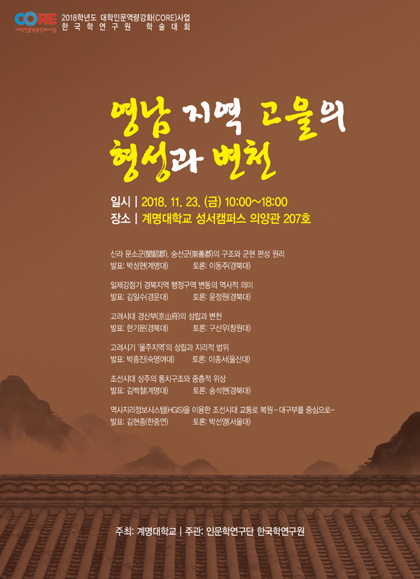 계명대학교 인문학연구단 한국학연구원은 ‘영남 지역 고을의 형성과 변천’을 주제로 한 학술대회를 개최하고자 합니다. 이 학술대회는 계명대학교 인문역량강화(CORE)사업 중 하나로 마련되었습니다.