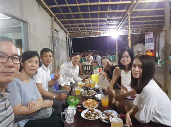 끌로 시내로 들어왔다. 좌측으로 끌로 해변이 보인다. 뜨거운 한낮이라 해변에는 사람들이 보이지 않는다. 작년 미스베트남 선발대회가 열렸다는 끌로 광장도 통과했다. 타이 씨의 집은 끌로 해변 가까이에서 대로변을 끼고 있었으며, 약 6개월 전에 완공한 3층짜리 새집이었다. 땅 사는데 7천만 원, 집 짓는데 1억 원, 모두 1억7천만 원이 들었다고 한다. 마침 퇴근하고 집에 온 자매를 만나 우리는 가방만 1층에 내려놓은 채, 관광용 전기차를 타고 저녁을 먹으러 나섰다. 언니인 아이 씨가 회사직원들과 자주 가던 해물 식당이라는데 재료도 신선하고 가격도 싸다고 했다. 관광용 전기차는 적당한 속도로 달려서 바람을 맞으며 끌로 시내의 야경을 만끽하기에 그만이었다. 곧 아이 씨의 회사 직원 두 명도 식당으로 합류했다. 의기투합한 7명은 조개, 새우, 생선, 채소류 등의 해물과 캔맥주를 곁들여 유쾌한 저녁 식사를 마쳤다. 럭셔리한 분위기는 아니었지만 현지 주민들이 애용하는 식당인지, 사람들로 바글바글했다. 식사가 끝나자 히업 씨는 하노이행 야간버스를 타기 위해 우리와 작별인사를 했다.