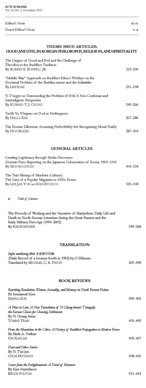 Acta Koreana 22-2가 2019년 12월 15일자로 발간되었습니다.Acta Koreana는 한국학의 세계화를 위하여 1998년 창간되었고, 매년 6월 15일과 12월 15일, 연2회 발간하는 한국학 영문저널입니다. 한국연구재단의 KCI(Korea Citation Index)뿐만 아니라, 톰슨로이터의 A&HCI(Arts & Humaities citation Index)와 앨스비어의 SCOPUS에도 등재된 세계수준의 한국학 저널입니다. 연중 논문을 접수하며, 엄격한 심사제도를 거쳐 선별된 인문학 및 예술분야의 한국학 논문을 수록하고 있습니다.