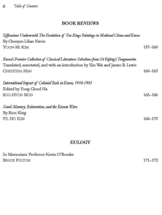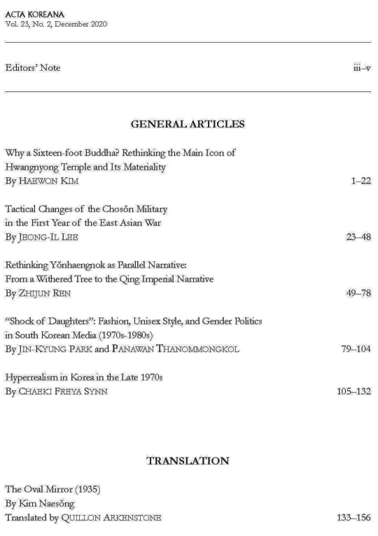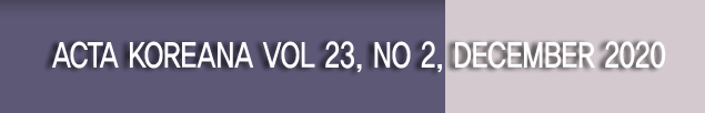 Acta Koreana 23-2이 2020년 12월 15일자로 발간되었습니다.Acta Koreana는 한국학의 세계화를 위하여 1998년 창간되었고, 매년 6월 15일과 12월 15일, 연2회 발간하는 한국학 영문저널입니다. 한국연구재단의 KCI(Korea Citation Index)뿐만 아니라, 톰슨로이터의 A&HCI(Arts & Humaities citation Index)와 앨스비어의 SCOPUS에도 등재된 세계수준의 한국학 저널입니다. 연중 논문을 접수하며, 엄격한 심사제도를 거쳐 선별된 인문학 및 예술분야의 한국학 논문을 수록하고 있습니다.