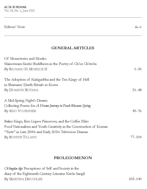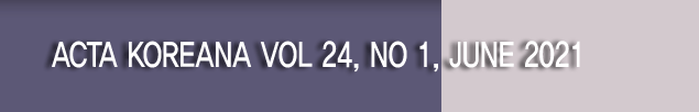Acta Koreana 24-1이 2021년 6월 15일자로 발간되었습니다.Acta Koreana는 한국학의 세계화를 위하여 1998년 창간되었고, 매년 6월 15일과 12월 15일, 연2회 발간하는 한국학 영문저널입니다. 한국연구재단의 KCI(Korea Citation Index)뿐만 아니라, 톰슨로이터의 A&HCI(Arts & Humaities citation Index)와 앨스비어의 SCOPUS에도 등재된 세계수준의 한국학 저널입니다. 연중 논문을 접수하며, 엄격한 심사제도를 거쳐 선별된 인문학 및 예술분야의 한국학 논문을 수록하고 있습니다.