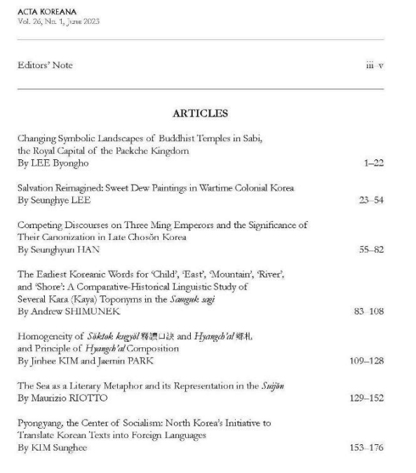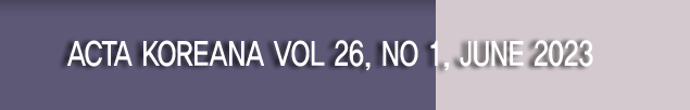 Acta Koreana 26-1호가 2023년 6월 15일 자로 발간되었습니다. Acta Koreana는 한국학의 세계화를 위하여 1998년 창간되었고, 매년 6월 15일과 12월 15일, 연 2회 발간하는 한국학 영문저널입니다. 한국연구재단의 KCI(Korea Citation Index)뿐만 아니라, 톰슨로이터의 A&HCI(Arts & Humaities citation Index)와 엘스비어의 SCOPUS에도 등재된 세계 수준의 한국학 저널입니다. 연중 논문을 접수하며, 엄격한 심사를 거쳐 선별된 인문학 및 예술 분야의 한국학 논문을 수록하고 있습니다.