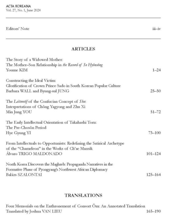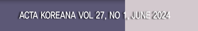 Acta Koreana 27-1호가 2024년 6월 15일 자로 발간되었습니다. Acta Koreana는 한국학의 세계화를 위하여 1998년 창간되었고, 매년 6월 15일과 12월 15일, 연 2회 발간하는 한국학 영문저널입니다. 한국연구재단의 KCI(Korea Citation Index)뿐만 아니라, 톰슨로이터의 A&HCI(Arts & Humaities citation Index)와 엘스비어의 SCOPUS에도 등재된 세계 수준의 한국학 저널입니다. 연중 논문을 접수하며, 엄격한 심사를 거쳐 선별된 인문학 및 예술 분야의 한국학 논문을 수록하고 있습니다.