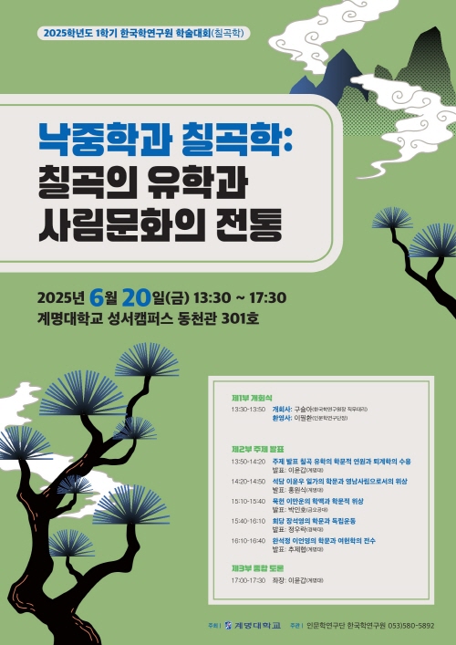 한국연구원은 2023년 대구를 대상으로 <낙중학과 대구학, 300년 영남의 수도 대구를 말하다>라는 주제로 학술대회를 개최한 바 있습니다. 본 연구는 바로 이러한 기획의 연장선상에서 칠곡지역 유학에 대한 재검토를 목적으로 합니다. 특히 낙중학의 전체적 흐름을 공유하면서도 칠곡지역만의 유학적 특징은 무엇이며, 그 학적 전통이 어떻게 계승되고 있는지를 살펴보려고 합니다.
