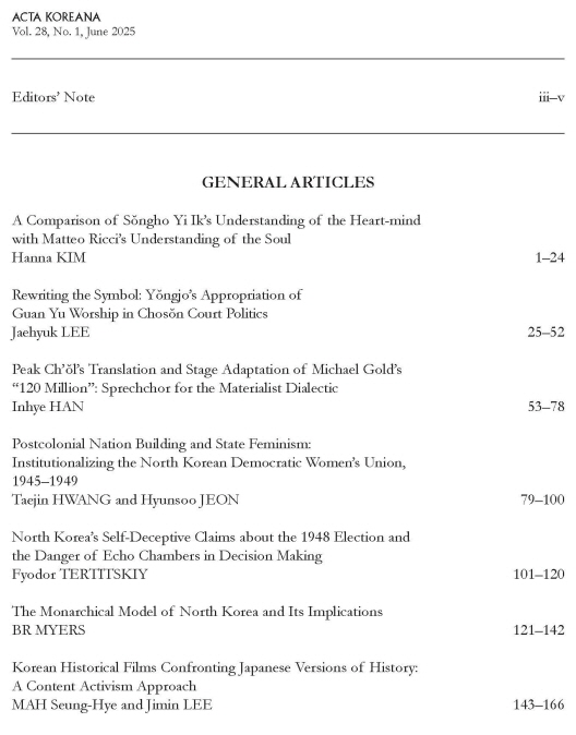Acta Koreana 28-1호가 2025년 6월 30일 자로 발간되었습니다. Acta Koreana는 한국학의 세계화를 위하여 1998년 창간되었고, 매년 6월 15일과 12월 15일, 연 2회 발간하는 한국학 영문저널입니다. 한국연구재단의 KCI(Korea Citation Index)뿐만 아니라, 톰슨로이터의 A&HCI(Arts & Humaities citation Index)와 엘스비어의 SCOPUS에도 등재된 세계 수준의 한국학 저널입니다. 연중 논문을 접수하며, 엄격한 심사를 거쳐 선별된 인문학 및 예술 분야의 한국학 논문을 수록하고 있습니다.