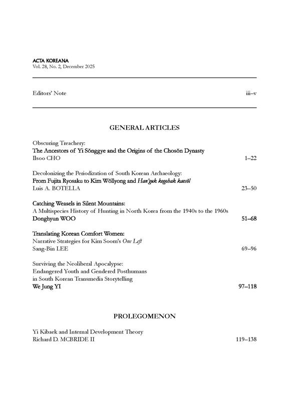 Acta Koreana 28-2호가 2025년 12월 15일 자로 발간되었습니다. Acta Koreana는 한국학의 세계화를 위하여 1998년 창간되었고, 매년 6월 15일과 12월 15일, 연 2회 발간하는 한국학 영문저널입니다. 한국연구재단의 KCI(Korea Citation Index)뿐만 아니라, 톰슨로이터의 A&HCI(Arts & Humaities citation Index)와 엘스비어의 SCOPUS에도 등재된 세계 수준의 한국학 저널입니다. 연중 논문을 접수하며, 엄격한 심사를 거쳐 선별된 인문학 및 예술 분야의 한국학 논문을 수록하고 있습니다.