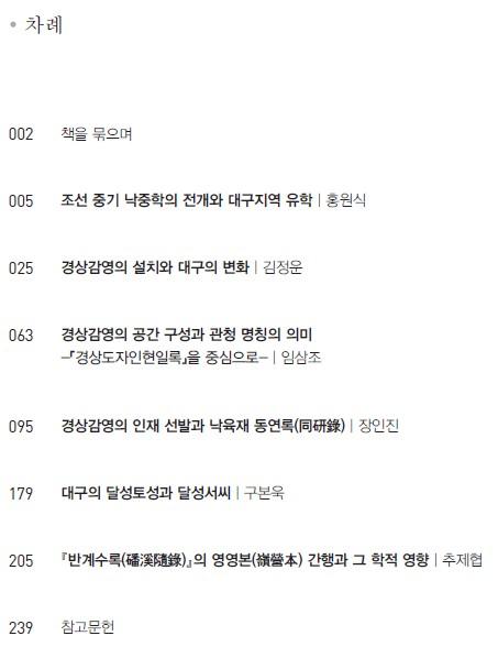 '낙중학'의 지난 1단계 사업이 각 시대별 학자군을 선별하여 문사철을 중심으로 살펴봤다면, 2023년부터 진행될 이번 2단계 사업은 '낙중학의 지역적 전개 양상'이라는 목표 아래 낙동강 중류 지역에 대한 종합적인 검토를 위한 학술대회를 추진하고 있다. 본 책은 그 첫 학술대회의 결과물이다. '대구학', 즉 대구의 정체성과 위상을 밝히는 데 목적이 있다. 특히 경상감영 설치와 대구의 위상, 근대전환기 대구의 변모 양상과 위상에 중점을 두되, 이번에는 조선 중기 경상감영의 성립 전후의 대구 학술과 문화 상황을 중심으로 그 특징적인 면모를 다루었다.